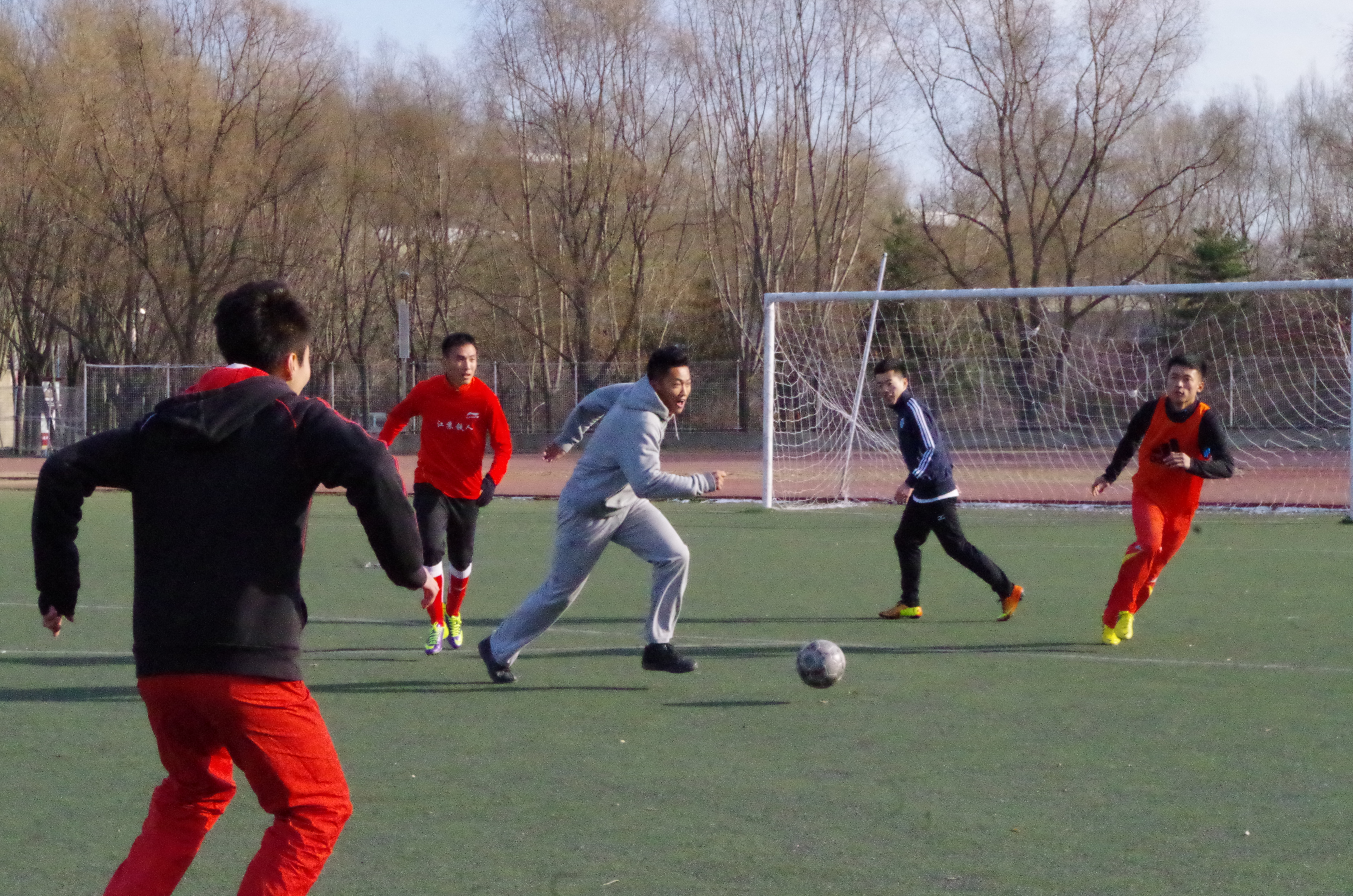 比赛开始之前,参赛队员们在场边做着准备活动,空气中仿佛弥漫着紧张的气息。而这稍带紧张的气息以及赛场上凸显的积极拼搏、进取的精神也吸引了许多其他专业同学们的围观。下午1点半,随着裁判员的一声哨响,比赛正式开始,双方队员也迅速进入状态,比赛一开场双方球员就展开了激烈的争夺。开赛不久,专业班就以一记精彩的进球赢得阵阵欢呼。学术班队员的体力较专业班队员稍逊一筹,球员之间的战术配合也相对混乱,在专业班多次猛烈的进攻下,学术班再次防守失误,专业班再进一球,比分逐渐拉开。时间一点一滴地过去,学术班的队员们全力进攻,但始终未打开专业班的大门,上半场比赛以2:0结束。