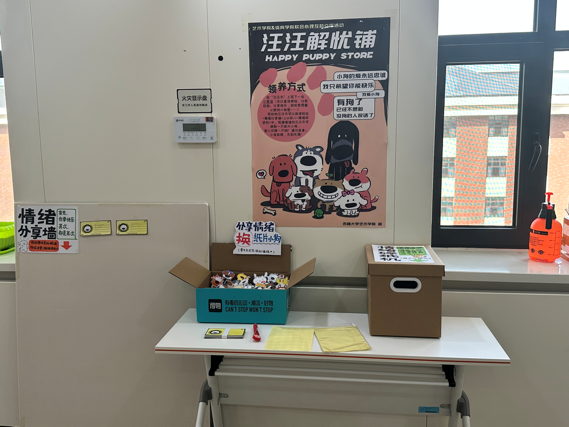 与艺术学院研究生合作,共同绘制、裁剪制作了许多可爱的纸片小狗,并精心设计了活动海报及宣传标语。5月6日上午7点30分:“汪汪解忧铺”正式开业!许多同学闻声前来,将自己亲手书写的情绪“汪汪币”张贴在情绪分享墙上或是将其投入在“情绪碎纸机”中,以换取领养专属可爱小狗的资格。在48小时的活动时间内,所有的小狗都有了自己的“新主人”!