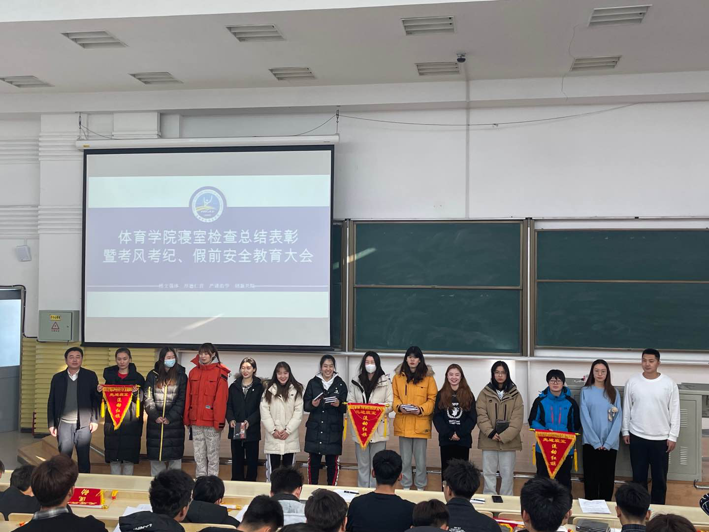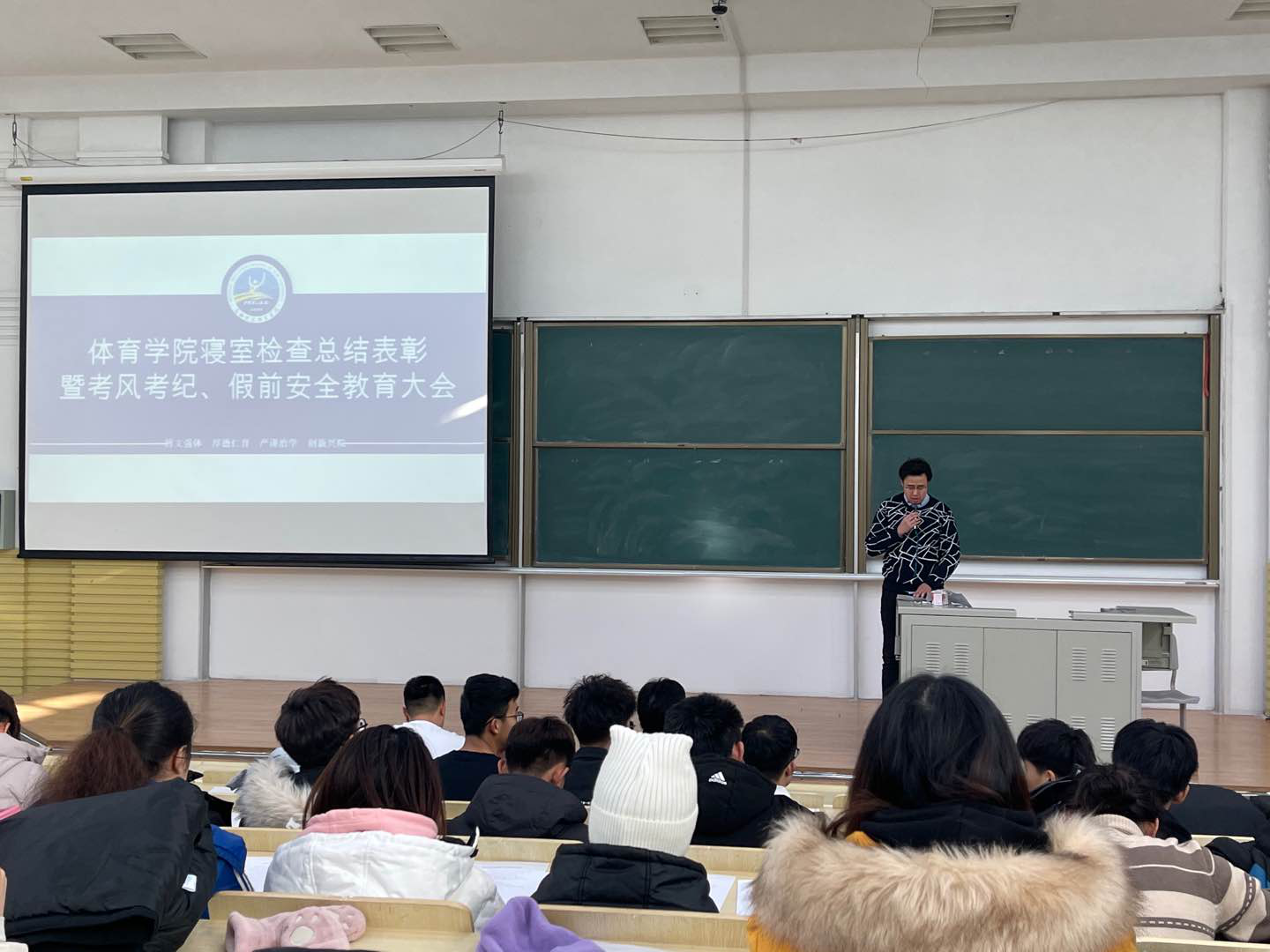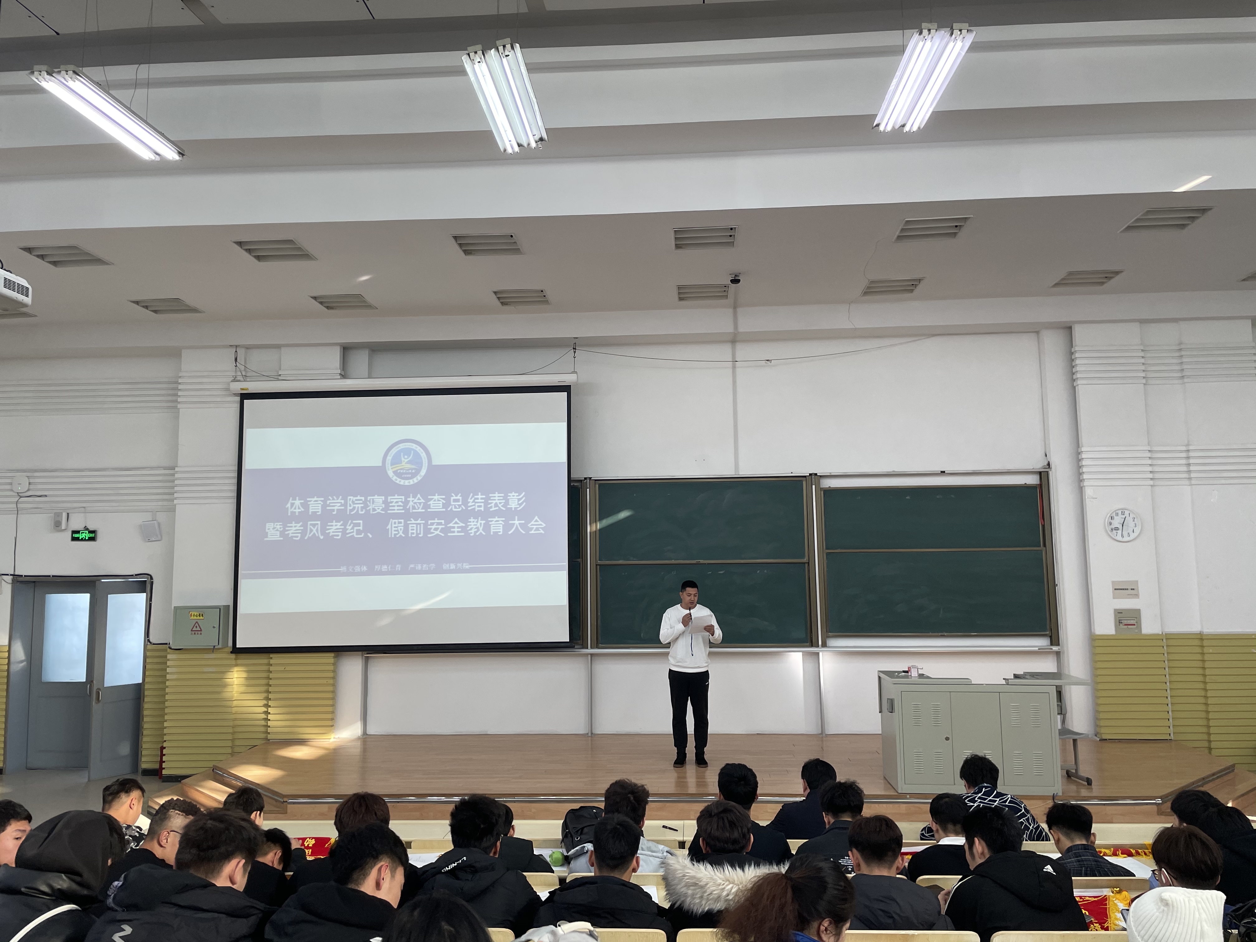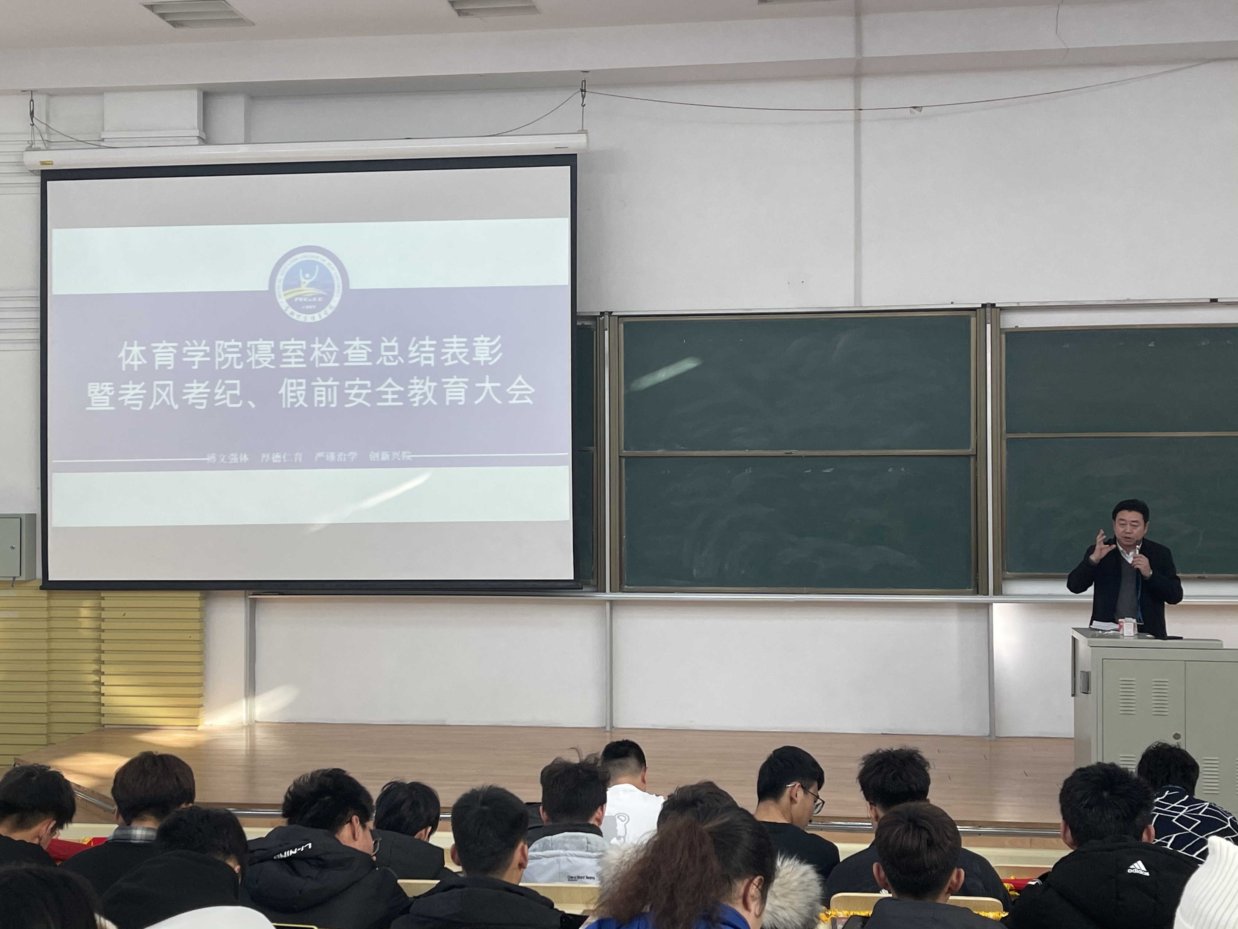 在逸夫楼第十阶梯教室召开本学期寝室检查总结表彰暨考风考纪、假前安全教育大会。学院党委副书记兼副院长田进、全体辅导员和全院本科生参加本次大会。