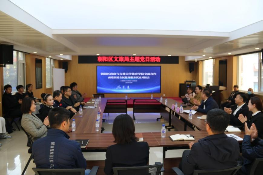 党委书记逄锦彩、党委副书记兼副院长苑锐带领六支由专业教师和学生组成的社区体育指队赴前进街道文苑社区开展体育指导试点对接活动。朝阳区文化与旅游局党组书记邢时澍、局长姚默、副局长谭晓岩、牛菲及前进街道相关负责人、试点社区代表参加活动。