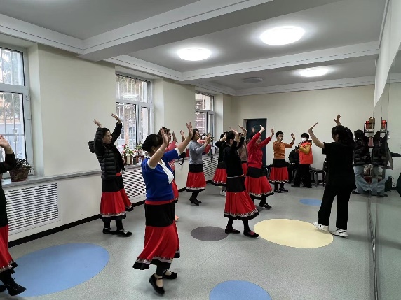 在前进街道文苑社区,体育指导队员认识为居民做做示范,现场气氛热烈融洽,吸引了更多的居民参与到体育运动中。