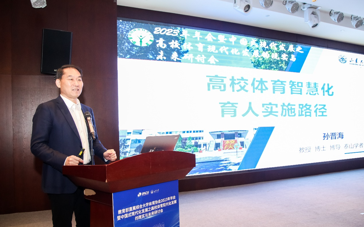 院长孙晋海以《高校体育智慧化育人的实施路径》为主题进行经验交流。经验交流会由中山大学体育部主任范振国主持。孙晋海教授全面深入阐述了高校体育智慧化育人的内涵,并进一步从时代需求、现实困境、路径设计和实施策略等维度系统探讨了高校体育智慧化育人新模式,为数字时代开创高校体育智慧化育人新篇章提供了重要参考和有益借鉴,为加快促进高校体育现代化发展提供了诸多富有建设性的思路和启发。