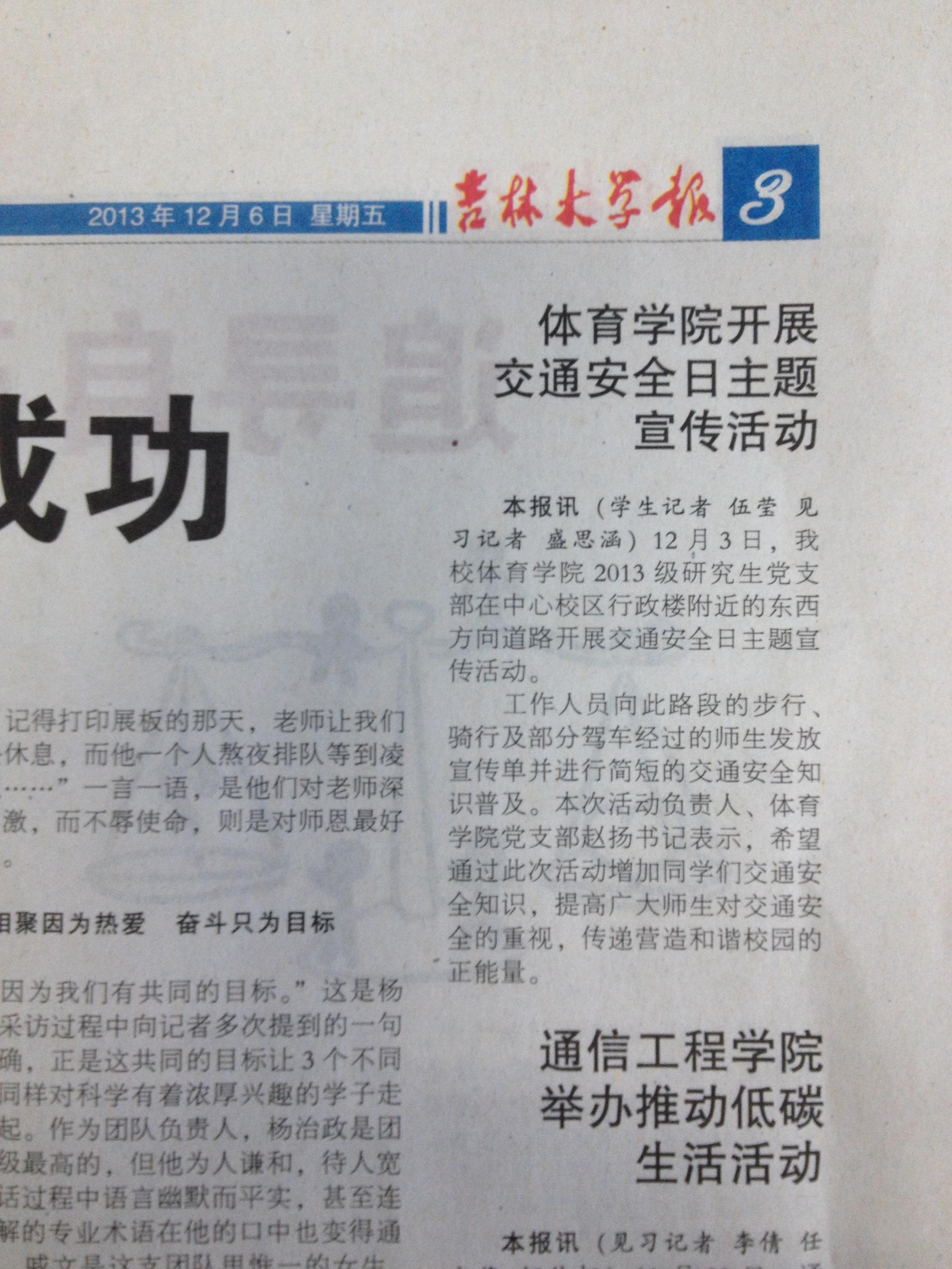 8x8x 报在2013年12月6日星期五第506期(复第1064期)第三版多彩校园显著位置报道了8x8x 研究生党支部开展的“宣传交通安全知识•倡导遵守交通法规•营造平安和谐校园”党的群众路线教育实践活动。