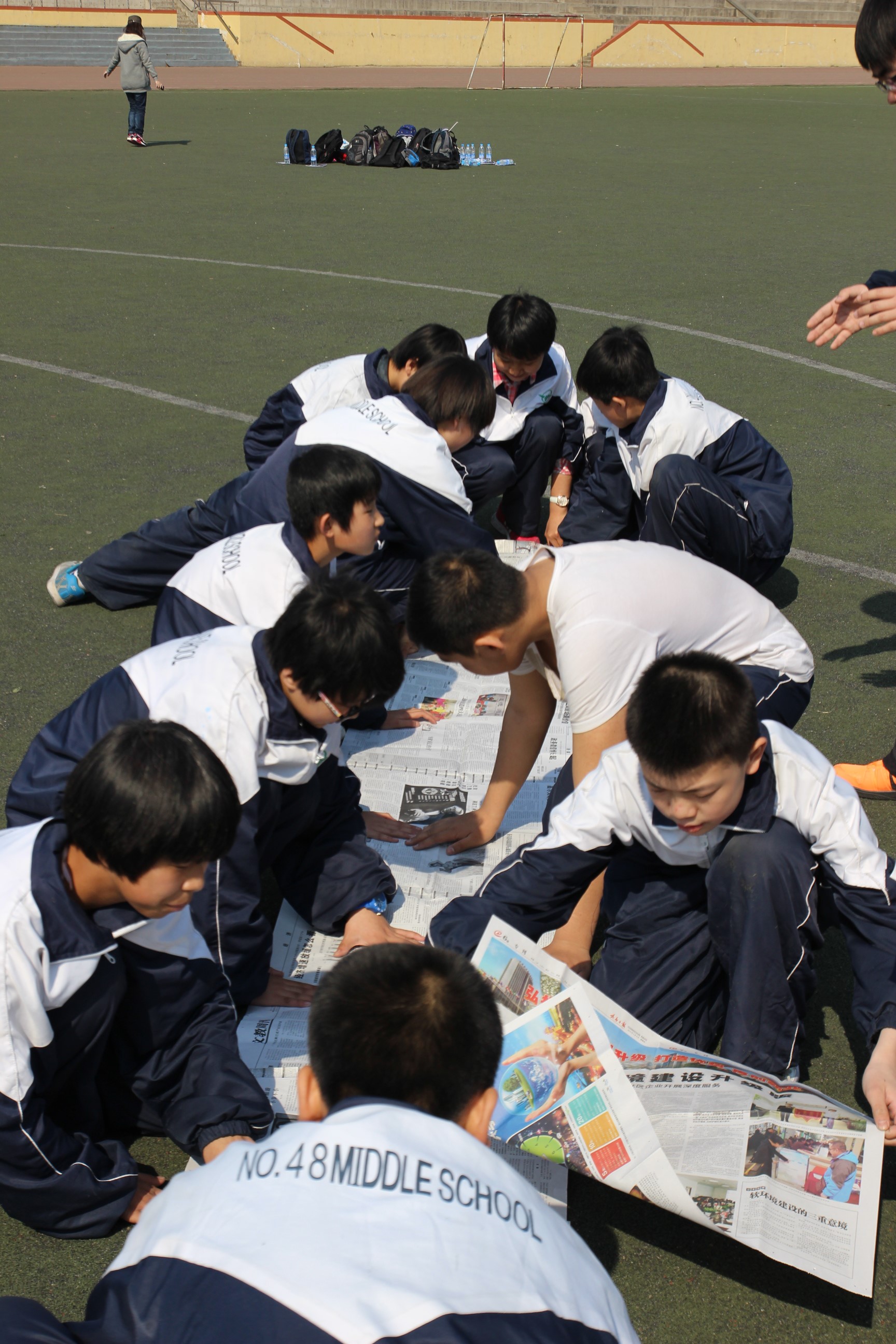 “喊数抱团”游戏的开始,拉开了这次素拓活动的序幕。第四十八中的同学们在素拓师和队长的带领下,开始了紧张的游戏环节,他们策划各自队名、口号和以及造型动作,一个个的斗志昂扬,仿佛是一个个威武的小将军 。紧接着便是活动“当你的秀发拂过我的胸膛”,同学们将他们澎湃的热情与激情展现的淋漓尽致。最后便是压轴大戏——无敌风火轮,经过15分钟精心的设计,各队的风火轮便初具规模,通过紧张而激烈的竞速比赛,将活动推向了高潮,最终在四轮风火轮抵达终点之后,本次的素质拓展活动划上了一个完美的句号,活动过后,大家合影留念。